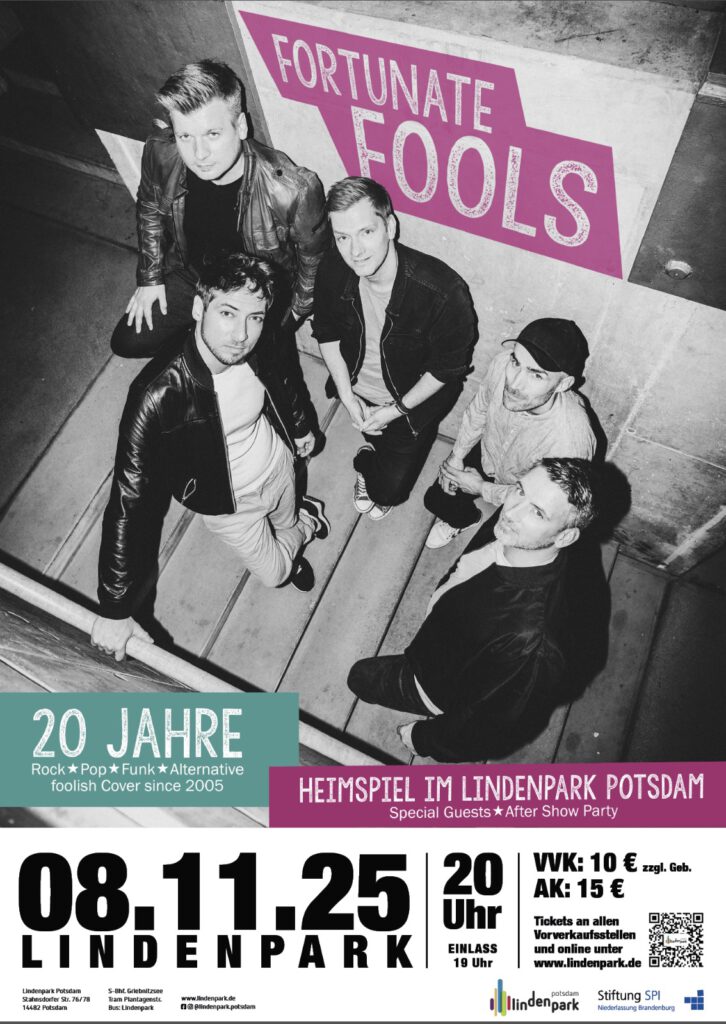Die Potsdamer Band „Fortunate Fools“ macht schon seit einiger Zeit die ganze Republik unsicher, von Berlin bis Hamburg, von Rügen bis ins Ländle und von Frankfurt/Oder bis in den Pott. Die hauptsächlich aus studierten Musikern bestehende junge Band weiß, wie man Stimmung macht, egal an welchem Ort. Mit Professionalität gewannen sie den Landesrockwettbewerb Brandenburg und produzierten ihr Debut-Album „Fools Rule!“. Dabei waren die Fortunate Fools schon immer als gefragte Party- und Coverband unterwegs.